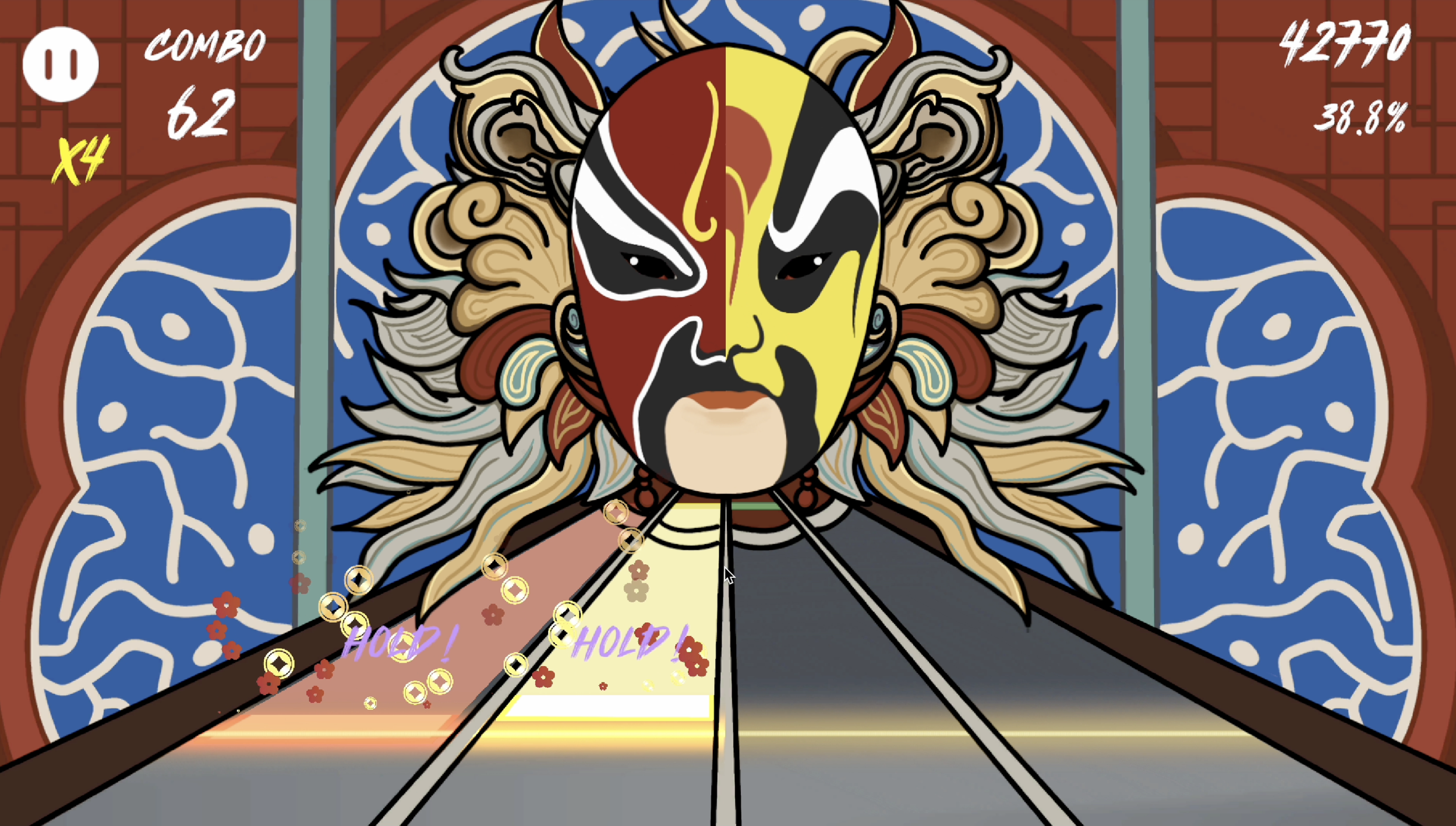 Players must react with speed and precision as notes travel toward the judgment line, pressing or holding the corresponding keys in time with the music to maintain their combo and score. The performance centers on a stylized Pixiu (貔貅), a mythical creature in Chinese folklore associated with protection and prosperity. Set against a festive New Year atmosphere, the characters’ shifting masks symbolize transformation, luck, and renewal, blending cultural symbolism with high-energy rhythm gameplay.